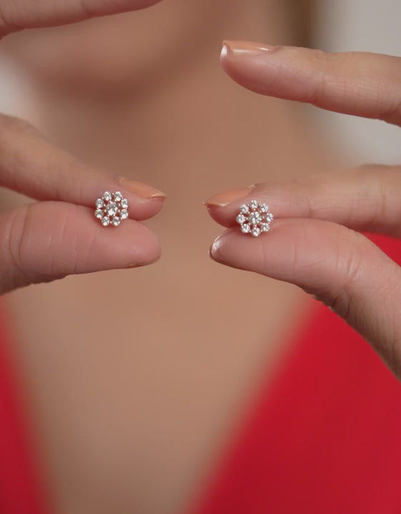 Add a touch of sparkling elegance with the 925 Sterling Silver CZ Studded Rose gold-Plated Floral Clustered Stud Earrings. Crafted from premium sterling silver and finished with a sleek rhodium plating, these earrings feature intricately arranged cubic zirconia stones in a floral cluster design, creating a dazzling, timeless look. Lightweight and comfortable for all-day wear, they effortlessly elevate both casual and formal outfits. A versatile and charming pair of silver earrings, perfect as a gift for her.